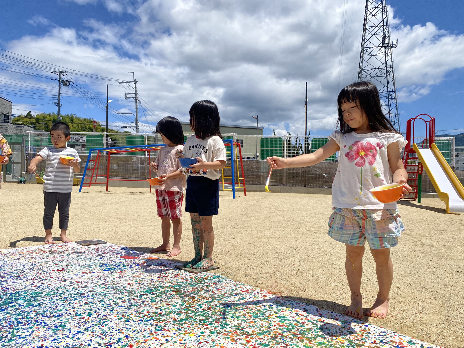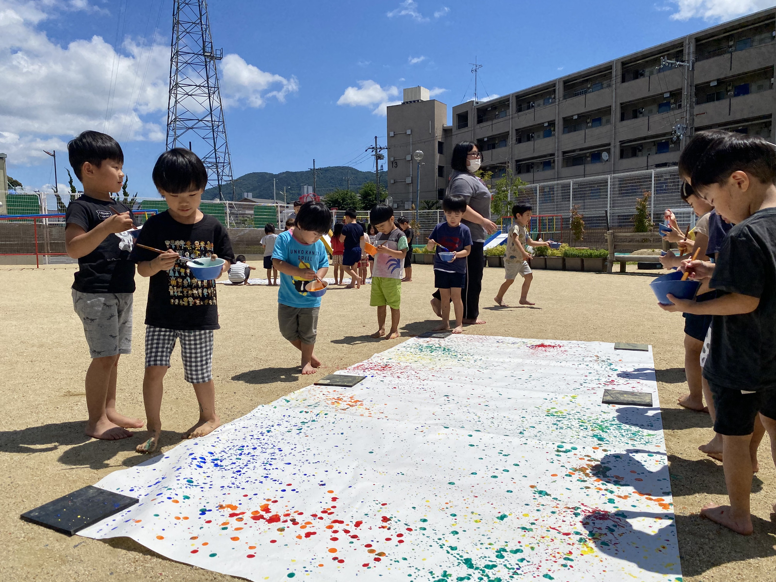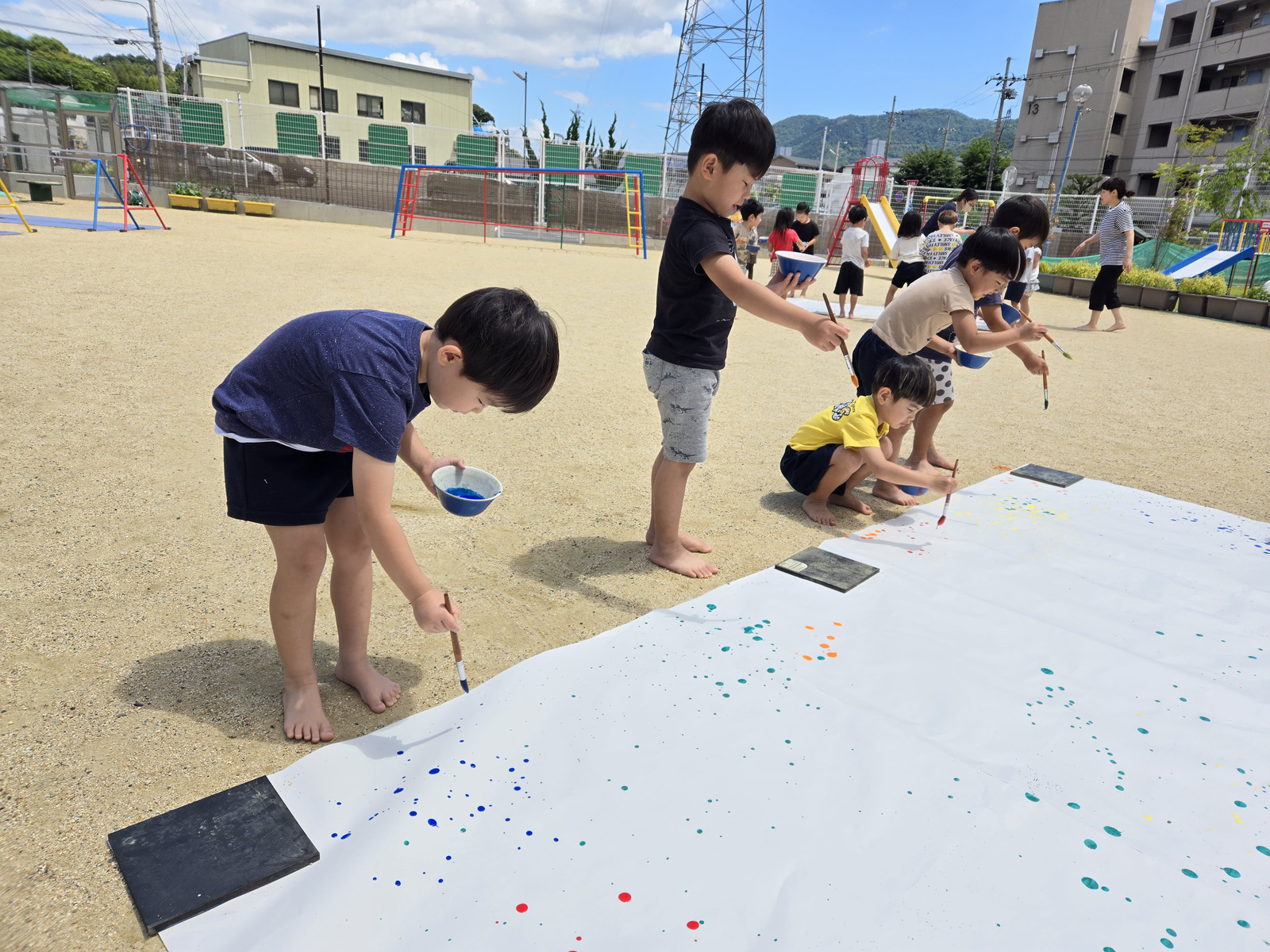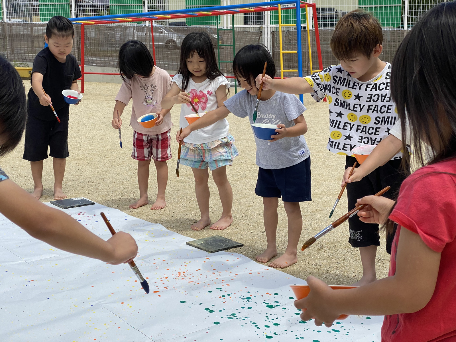 おおきな模造紙に絵具を筆でぽたぽた垂らしてみたり